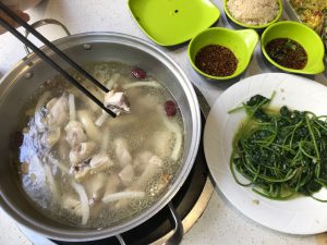 一上午就是休息闲逛,在酒店玩大富翁,中午去吃了附近老椰客的“椰子鸡”,椰子鸡就是把生鸡块放到椰汁汤底的锅里几分钟煮熟,所以特别嫩,再蘸上各种调料吃。海南人喜欢用绿色没熟的小金桔切开来,挤出汁水做调料,增加食物的酸味,有点像西方人用柠檬,别有风味。