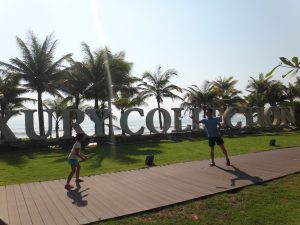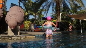 day 3到day 4的关键词是游泳、大海,还有大富翁,还有酒店的西班牙式建筑、椰林、泳池和自助早餐也很赞。闺女连续两天下午都在酒店游泳,day 4我们去亚龙湾,本来没打算游,只是看看海,结果她一看到海,就要下去玩?,我受不了可怜巴巴的乞求眼神,现给她和爸爸买了泳裤(对,是泳裤?),租了个小泳圈,让她下海玩去了。游完,她感慨了一句:“还是大海里游泳好玩啊!”——嗯啊,大自然当然比人工泳池好玩。